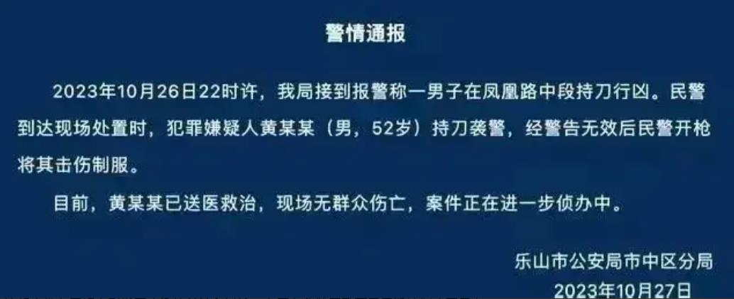 10月26日晚约22时,乐山市公安局市中区分局接到报警,称一名男子在凤凰路中段持刀行凶。民警赶到现场时,嫌犯黄某某(男,52岁)持刀袭警,民警进行了多次警告,但嫌疑人仍然不顾警告发动袭击。在嫌疑人试图砍向一名民警时,民警不得已开枪将其击伤,制服了嫌疑人。目前,嫌疑人已被送医治疗,没有群众伤亡,案件仍在进一步侦办中。