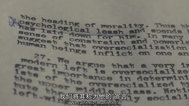 而男主真正了解并揭露炸弹客的真实身份,还是靠炸弹客自己发给纽约时报的宣言(manifesto)——《论工业社会及其未来》。在这份56页的宣言里,炸弹客铺陈了自己对现代社会的理念,男主通过这个宣言,探究炸弹客的语言习惯,最终推测出炸弹客的住址、大致外貌、年龄、学历以及获取学历的时间、童年经历、家庭生活等等。