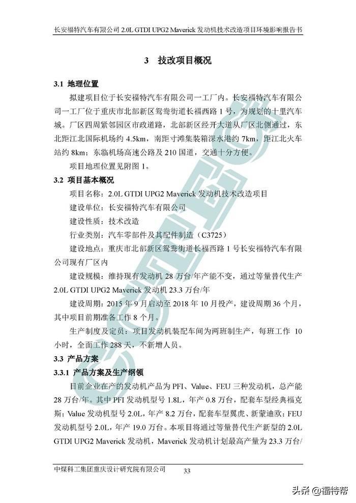 长安福特重庆发动机工厂三期项目内容为3台小排量发动机的产能扩充。包括对Dragon I3 1.5L GTDI(1.5T)及Fox1.0L GTDI UPG(1.0T)发动机技术改造,新增设计产能为29万台发动机/年。该项目完成后长安福特发动机工厂总规模达到109万台发动机/年。