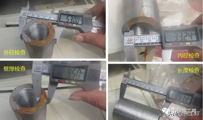 重要尺寸(外径、长度)及螺纹牙型、精度应经检验符合厂家产品设计图纸要求。内螺纹用专用的螺纹塞规检验,其塞通规应能顺利旋入,塞规旋入长度不得超过3P(P为一个螺距长度)。