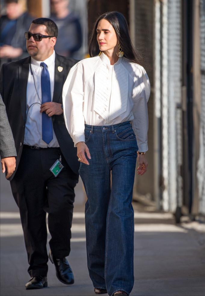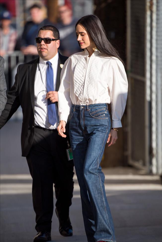 同年的2月,詹妮弗·康纳利现身洛杉矶街头前去参加活动,只见,身穿白衬衫下搭牛仔阔腿裤的她,外加经典的黑长直发加持,气场十足。