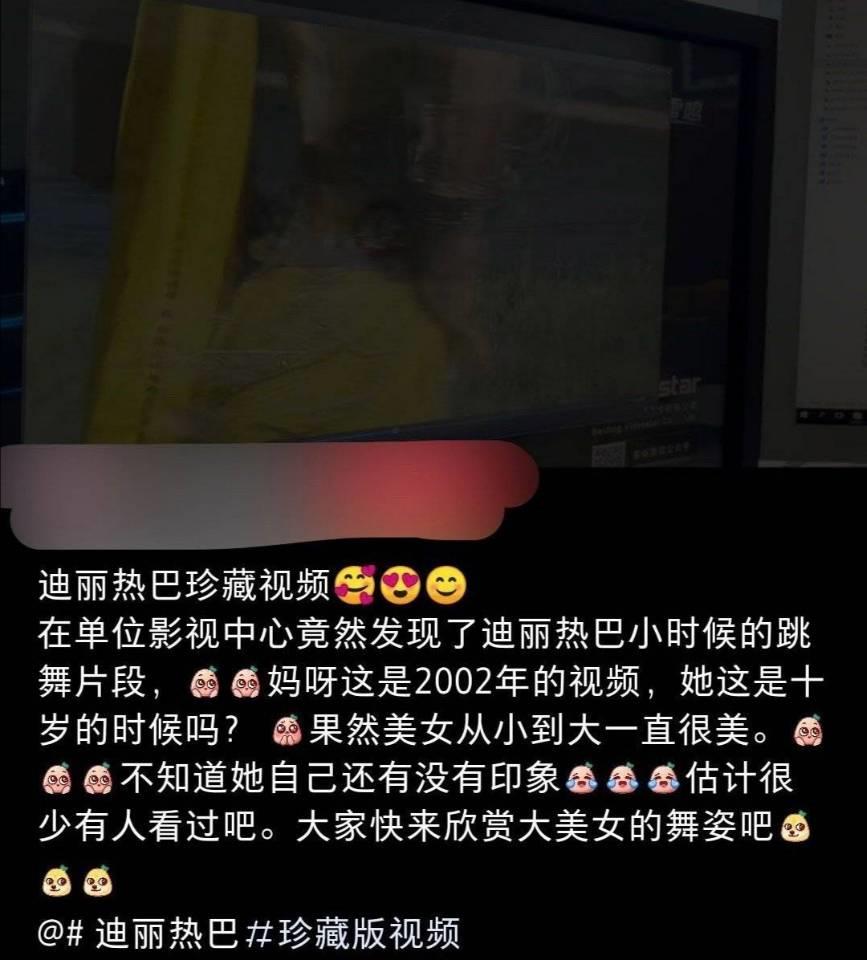 原视频发布者配文说是:迪丽热巴珍藏视频,在单位影视中心竟然发现了迪丽热巴小时候的跳舞片段,妈呀!这是2002年的视频,她这时是十岁的时候吗?果然美女从小到大一直很美。不知道她自己还有没有印象,估计很少有人看过吧。大家快来欣赏大美女的舞姿吧。
