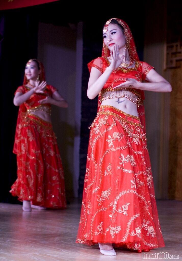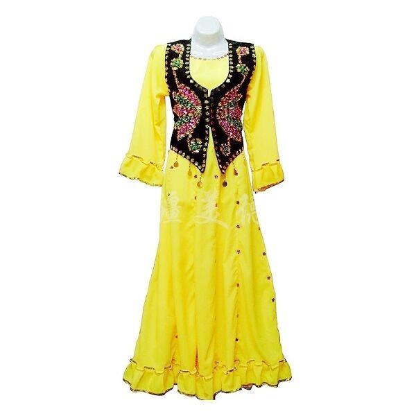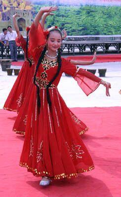 新疆的传统舞蹈服饰其实并没有露肚脐的服装,一般都是连体的长连衣裙下摆宽大。看过新疆舞的小伙伴应该都知道,新疆舞蹈特色一般有很多转圈和提裙边的舞蹈动作。因此,宽松的下摆便于转动时裙子更加飘逸也让舞蹈更加优雅好看。而现在舞台上露肚脐的演出服装可能是融入了印度风格的伪维吾尔族服装。