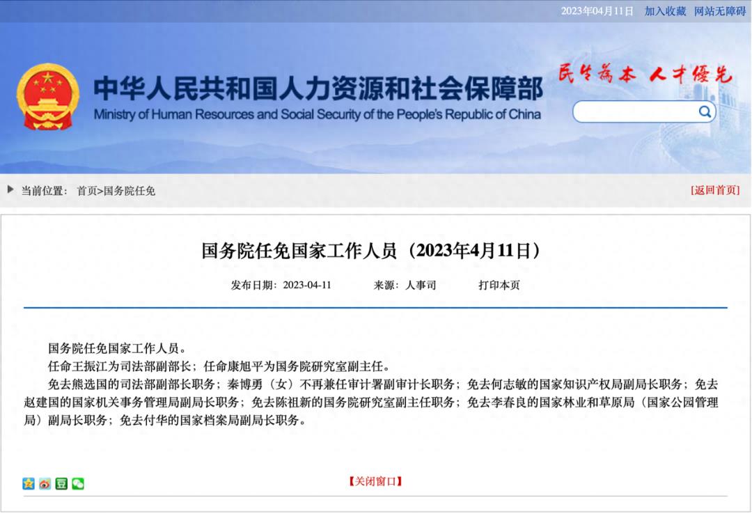 4月11日,据人社部官网消息,国务院任免国家工作人员: