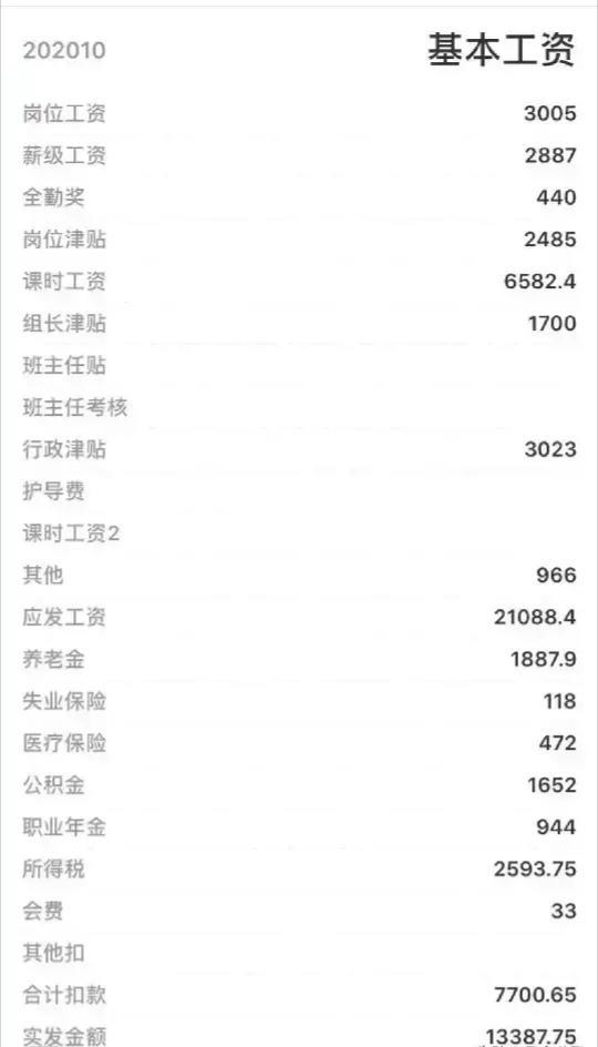 广州同样作为一线城市,当一名中学老师也还是可以的,工资和各种津贴加起来也是超过两万了,扣除五险一金和个人所得税等7700.65元,最后实发工资13387.75元。
