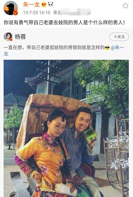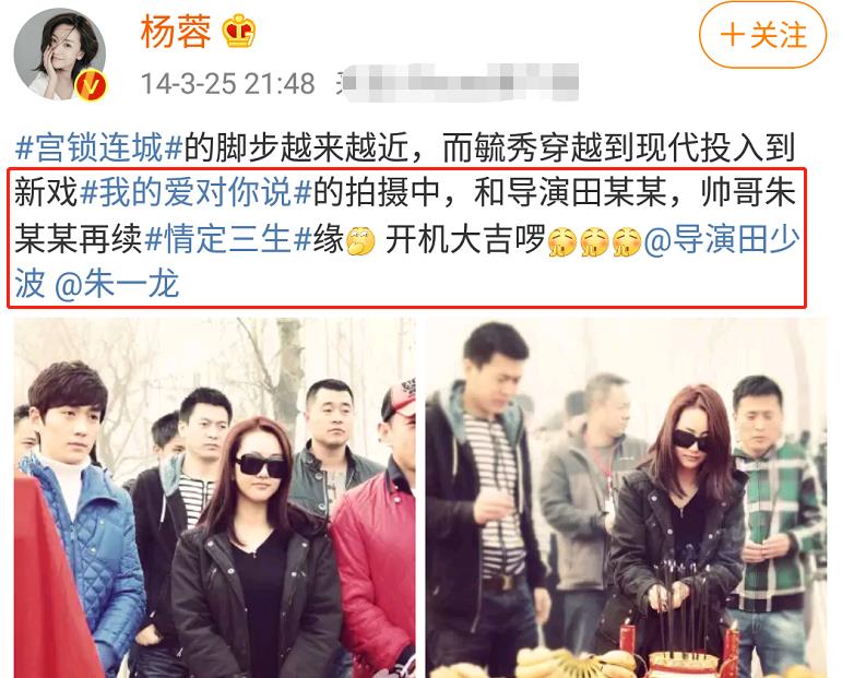 2013年7月《情定三生》开拍,一个女主一个男主,杨蓉还在自己的账号上发文调侃剧情和人设。这是朱一龙第一次出现在杨蓉账号,也是朱一龙第一次转发杨蓉动态,看语气他俩的关系应该挺不错。