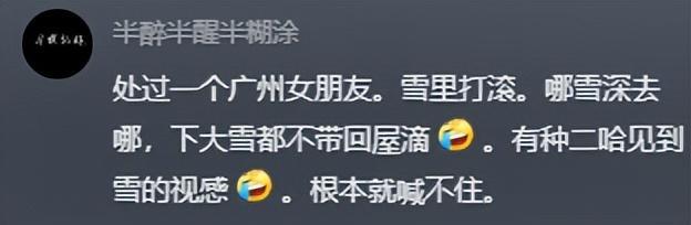 “处过一个广州女朋友。雪里打滚。哪雪深去哪,下大雪都不带回屋滴。有种二哈见到雪的视感。根本就喊不住。”