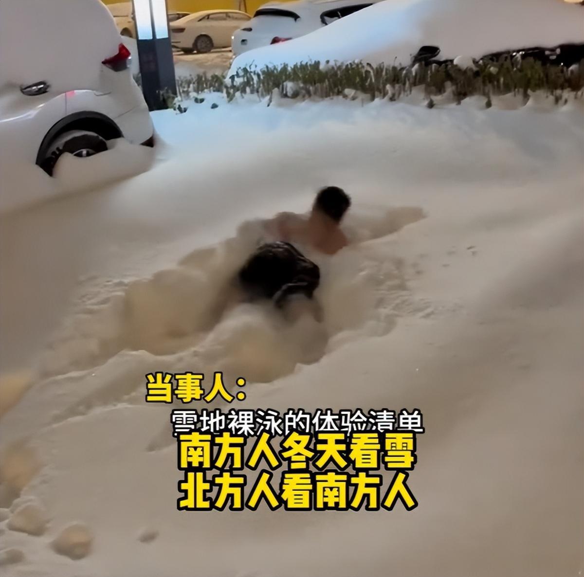 专属南方人的冬天游玩项目清单——雪地裸泳。北方大汉看了都得竖起大拇指,“真的勇士。”