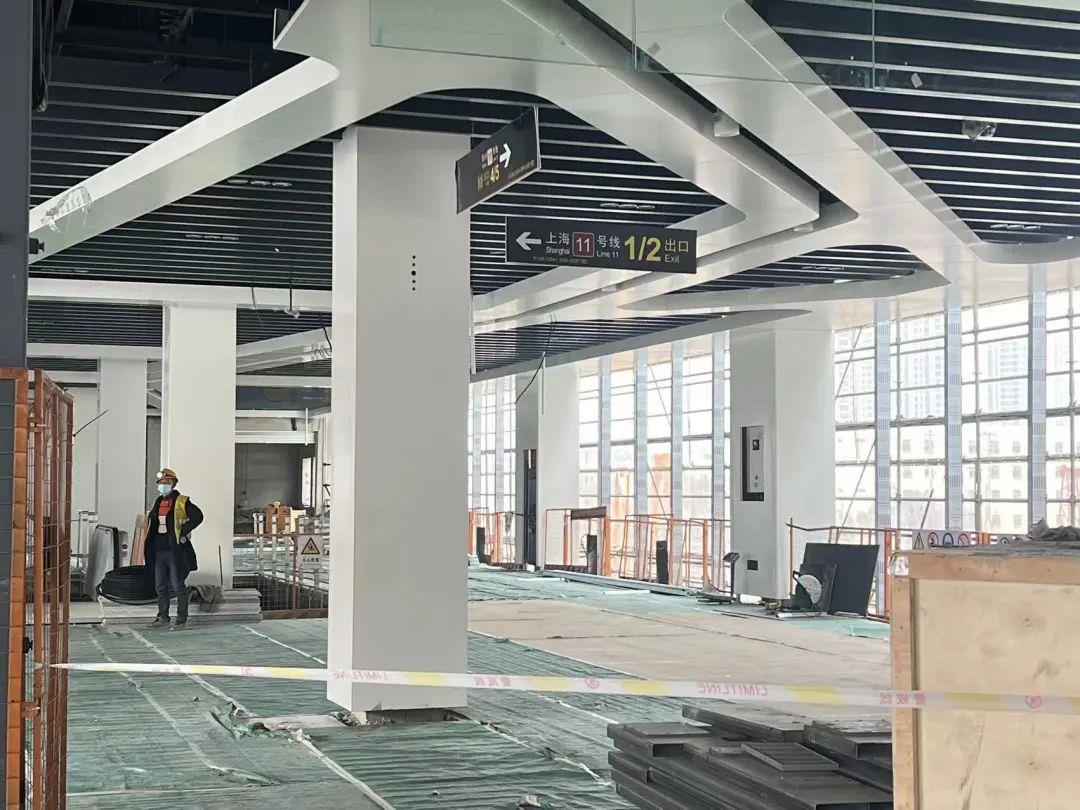 记者在现场看到,苏州轨道交通11号线在花桥站有三个出口可与上海地铁11号线换乘。乘客从苏州11号线花桥站地下一层上至地面后,再乘坐电梯上至二楼,通过车站间连廊至上海11号线花桥站。全程预估在五分钟以内,且换乘免安检。