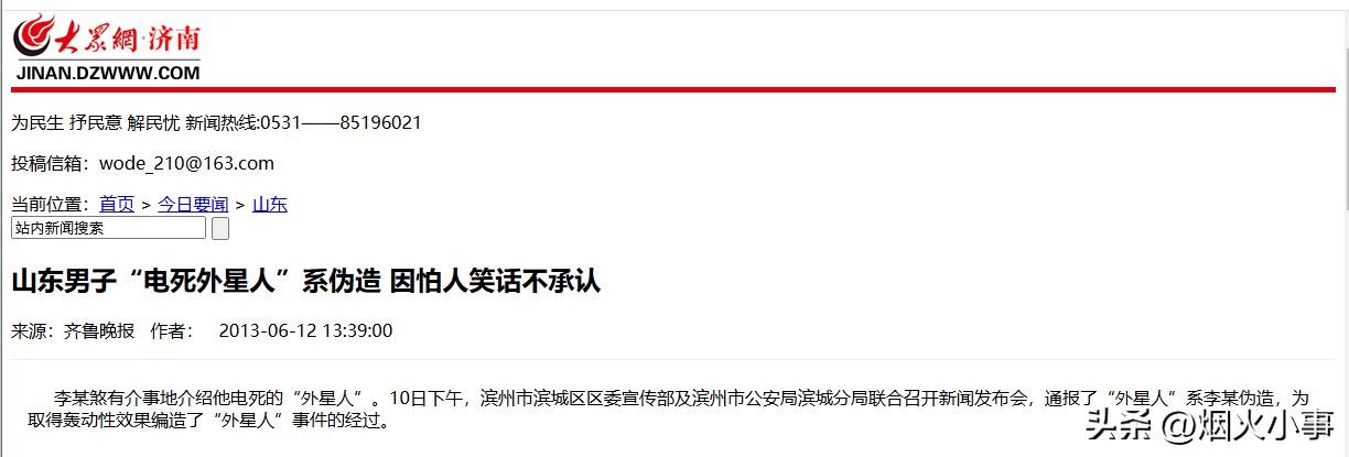 2、山东男子“电死外星人”系伪造 因怕人笑话不承认 齐鲁晚报 2013年6月12日发布