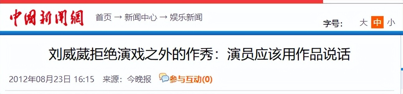 信息来源:2012年8月23日发表于中国新闻网——《刘威葳拒绝演戏之外的作秀:演员应该用作品说话》