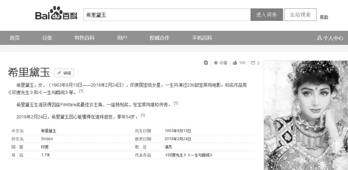 2018年2月24日,印度宝莱坞巨星希里黛玉Seidevi逝世