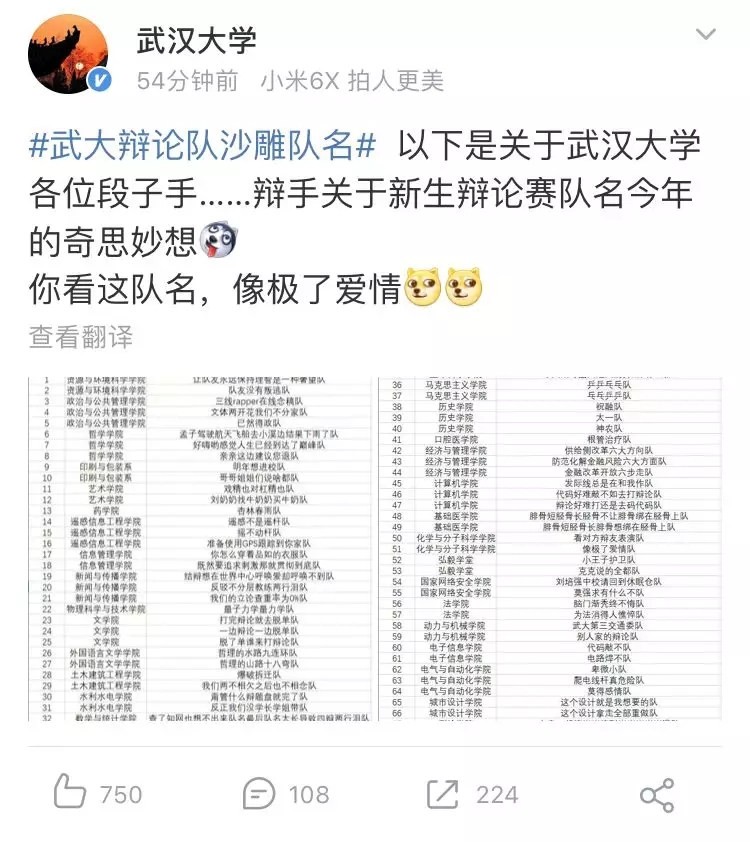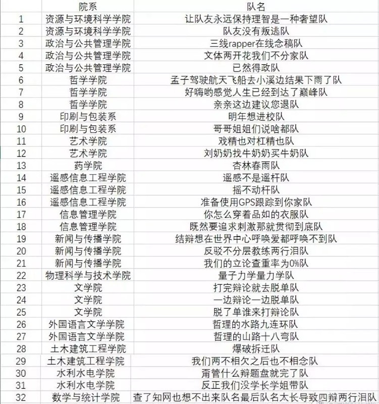 不知道大家是否还记得去年武汉大学新生辩论队令人笑岔气的奇葩队名,今天,武大的各位段子手……辩手又出来搞事了!