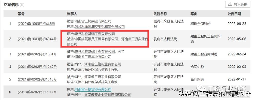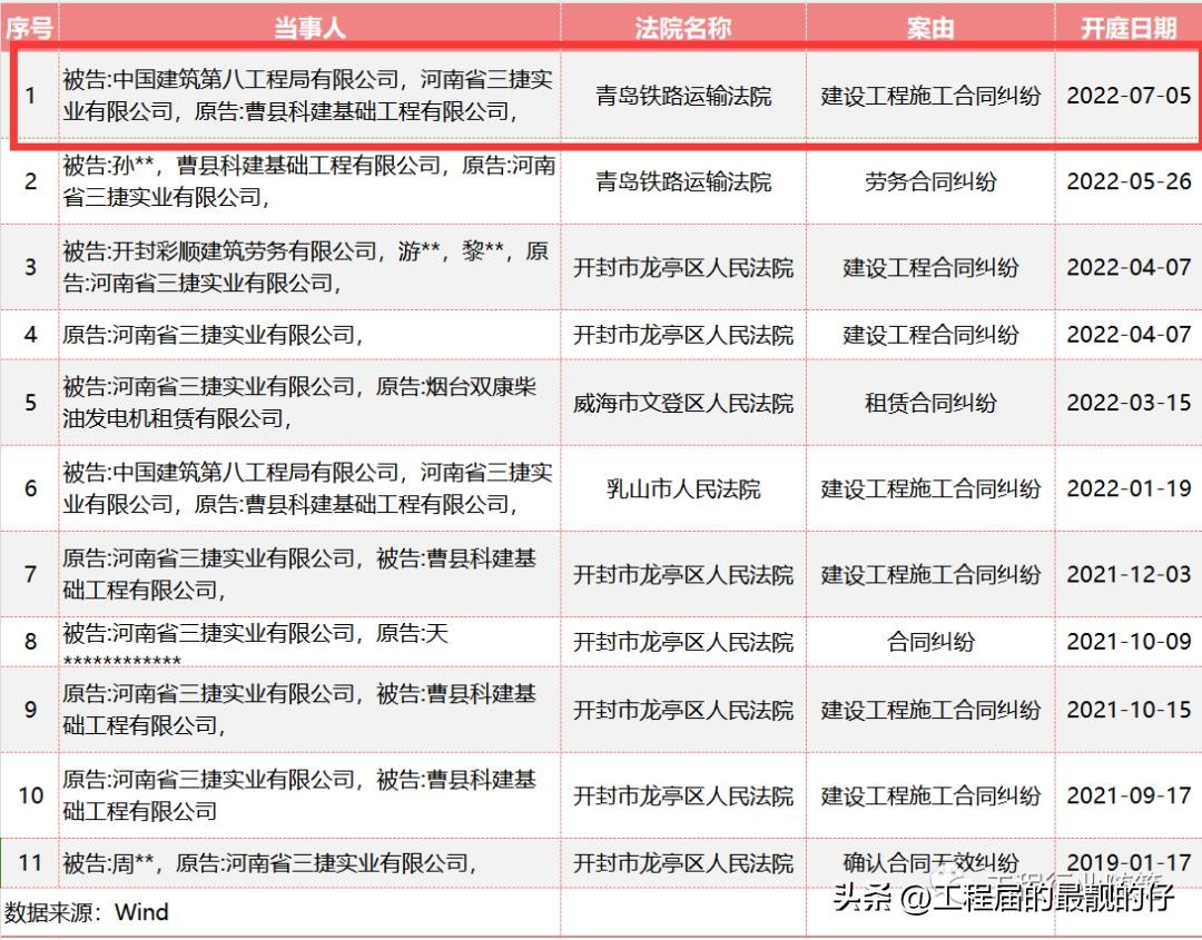 本次未爆出的其他相关方:据wind数据显示,早在2021年,河南省三捷实业有限公司与中建八局就因为建设工程施工合同纠纷,被曹县科建基础工程有限公司告上法庭,2021年12月27日在乳山市人民法院立案,并于2022年7月5日在青岛市铁路运输法院进行了开庭审理。河南三捷公司与曹县科建公司相互有过多次法律纠纷。具体立案和开庭信息如下: