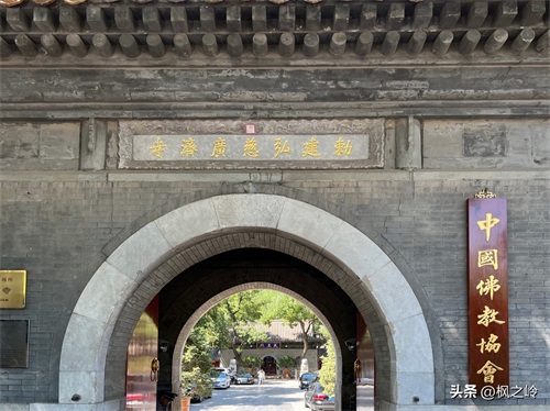 这两个牌匾,一个是竖着悬挂的牌子“中国佛教协会”,另一个镶嵌在门楣上的横额“敕建弘慈广济寺“。