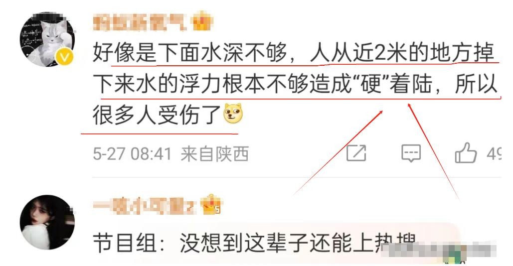 有网友爆料称,可能是因为闯关赛道下方的水池水位太低,导致参赛者掉下来时无法得到足够的缓冲,因而造成了严重的摔伤和骨折。