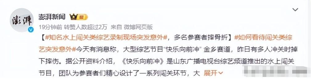 事情经过:今日有消息透露,昨日在大型综艺节目“快乐向前冲”的金乡赛道上,多名参赛者在冲关过程中意外摔伤,引起了广泛的关注和讨论。