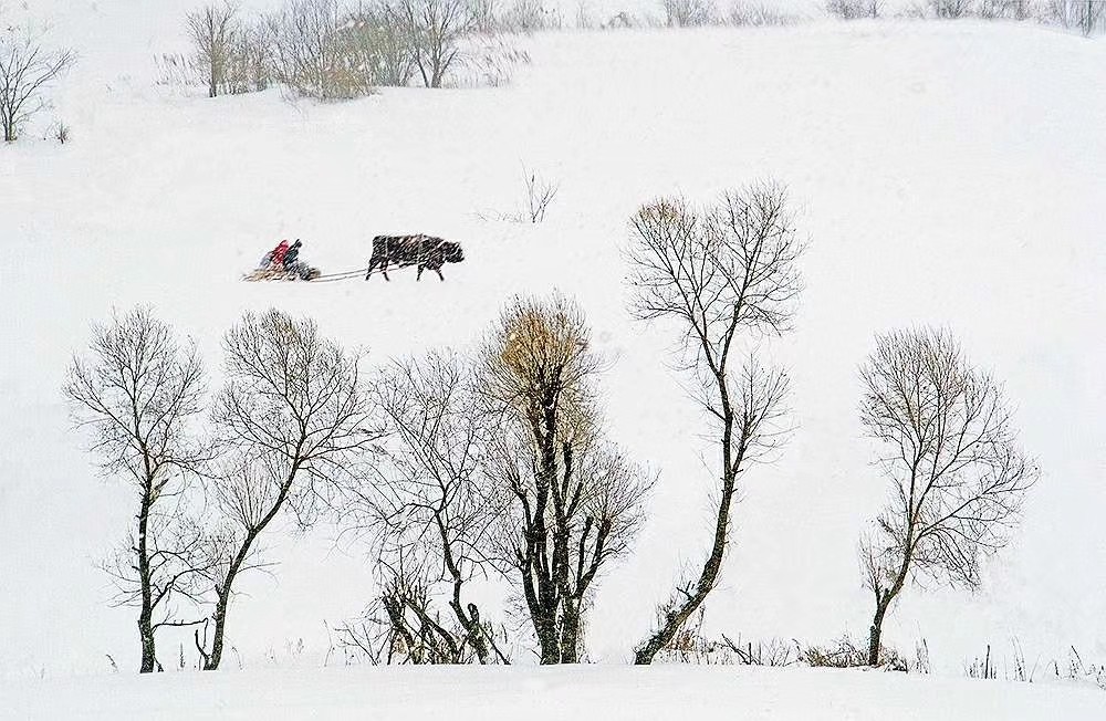 程英铁摄影。孤单的牛爬犁行驶在林海雪原中。