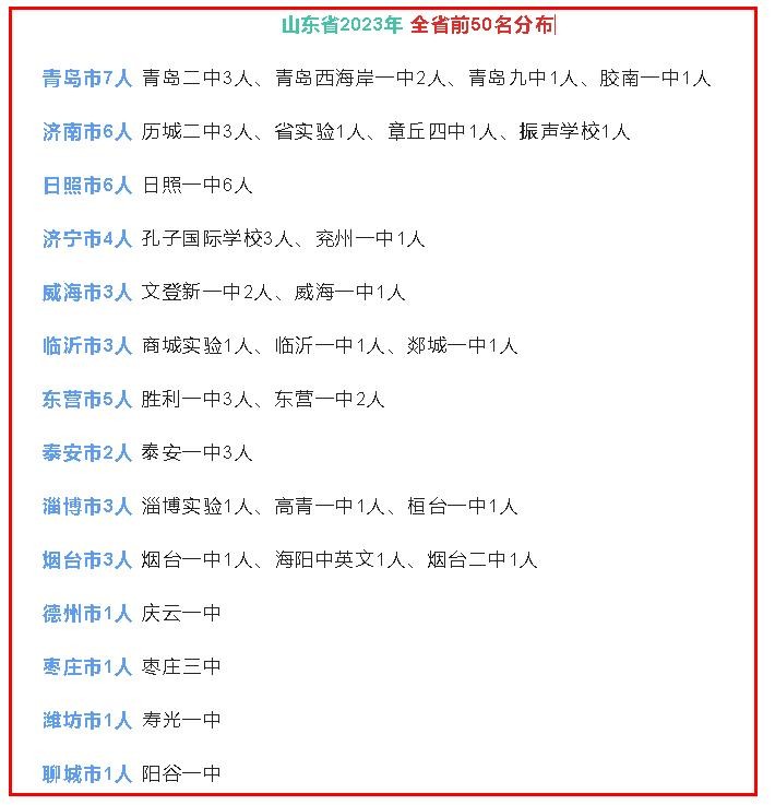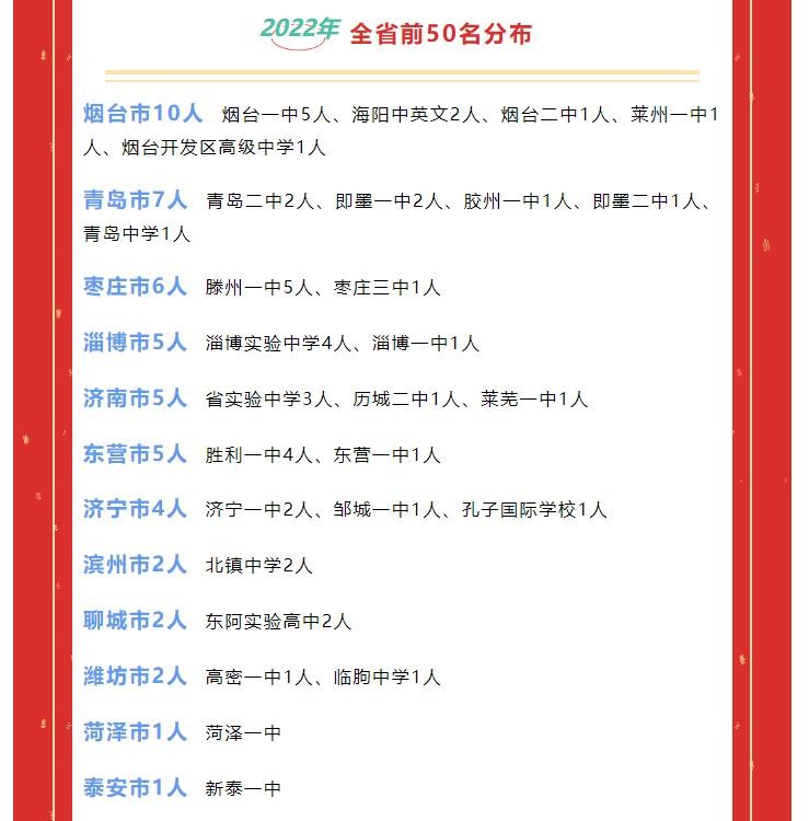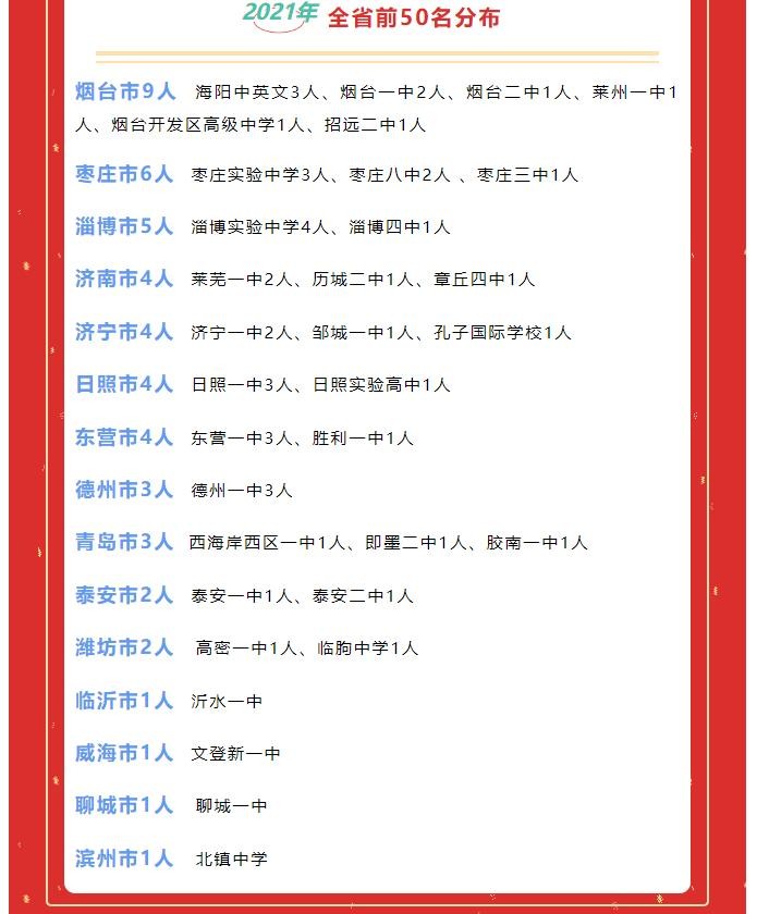 在进入省内前50名的考生人数方面,青岛、济南、日照位居前三。临沂作为人口第一大市,今年有3名同学进入全省前50名,在全省只算中等,但和去年无人进入全省前50名看,已经是很大的飞跃。
