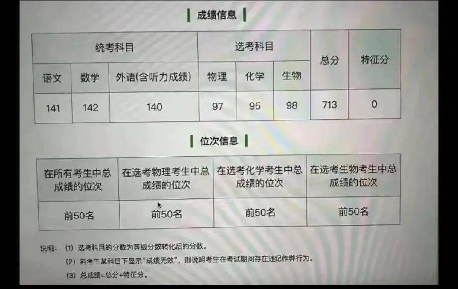 高考成绩:取得711分的好成绩,高考数学满分,语文125分、数学150分、英语145分、物理98分、化学97分、地理96分。