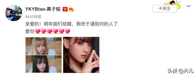 除了发自己女装P图照外,黄子韬还特意配文“亲爱的!明年咱们结婚,我终于遇到对的人了,爱你”。