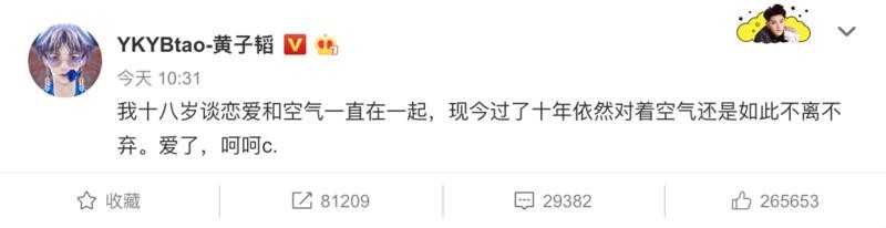 4月21日,黄子韬发微博表示:“我十八岁谈恋爱和空气一直在一起,现今过了十年依然对着空气还是如此不离不弃。爱了,呵呵。”语气中,对于自己一直单身这事儿颇有抱怨。