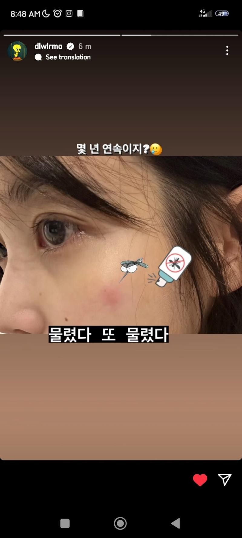 根据IU的说法,自己属于蚊子过敏,患有斯基特症候群!根据她的解释,患有此种疾病的人,一旦被蚊子叮咬,发病时皮肤会大面积发红、严重的浮肿和起水泡,如果脸部皮肤被蚊子叮咬,会留下疤痕。