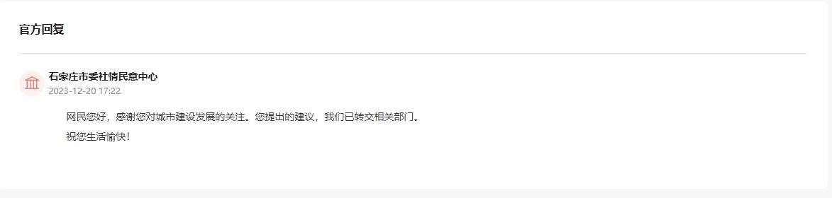 对此,石家庄市委社情民意中心回复称,该网友提出的建议,已转交相关部门。