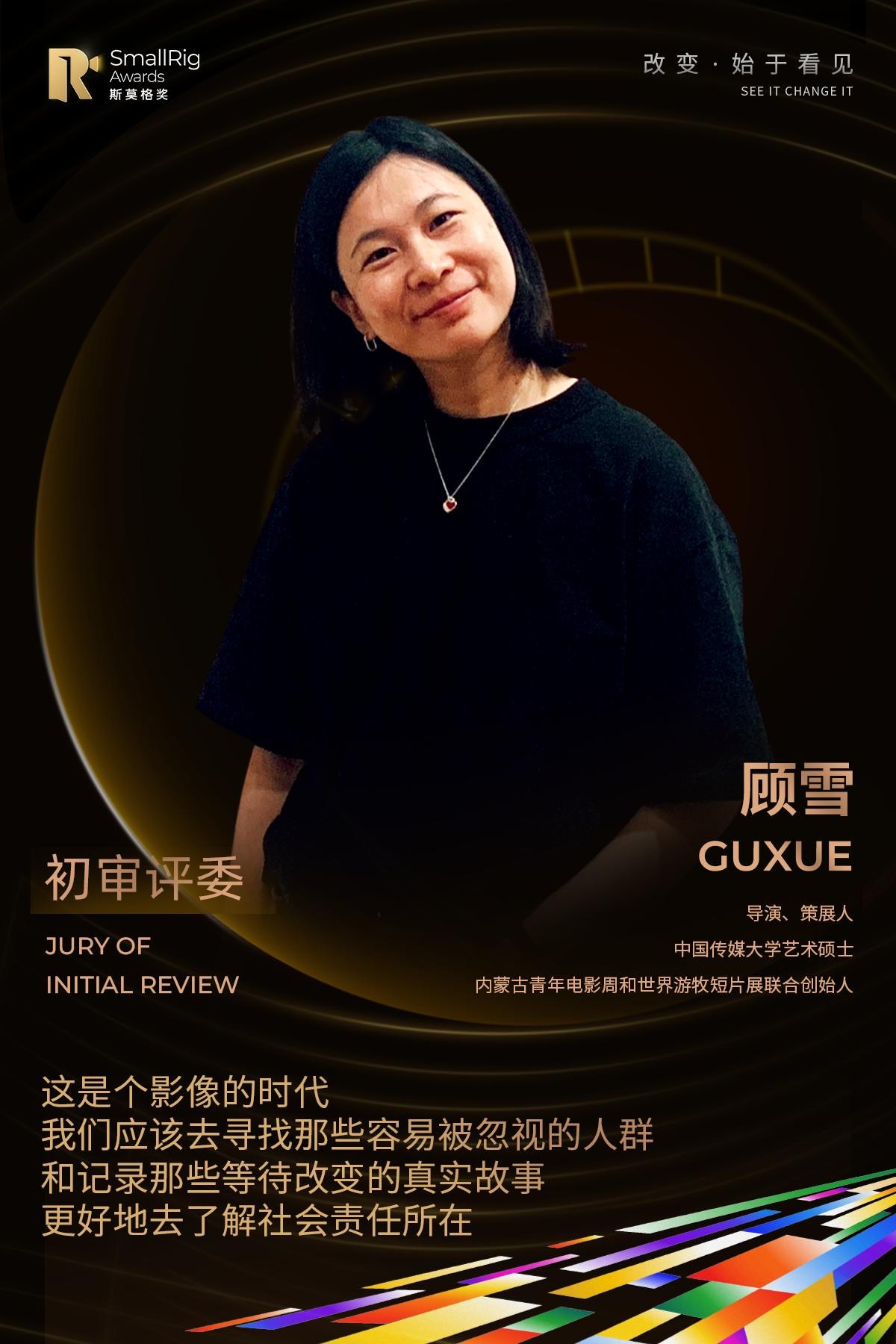 中国传媒大学艺术硕士,致力于关注家庭,探讨影像的日常写作,其作品《家庭会议》、《鼓楼之下》、《庚子新年》入围国内外多个电影节。她是内蒙古青年电影周和世界游牧短片展联合创始人,并任西宁FIRST青年电影展、广州国际纪录片电影节、西湖国际纪录片大会、HiShorts!厦门短片周纪录片单元初选评委。作为策展人,策划《新少数民族当代呓语》、《把摄影机指向自己—家庭影像展》、《重构家庭记忆》等电影展。2022年,顾雪创办了家庭影像FamilyLens,致力于发现和拓展家庭影像边界,探索个人影像书写记录。