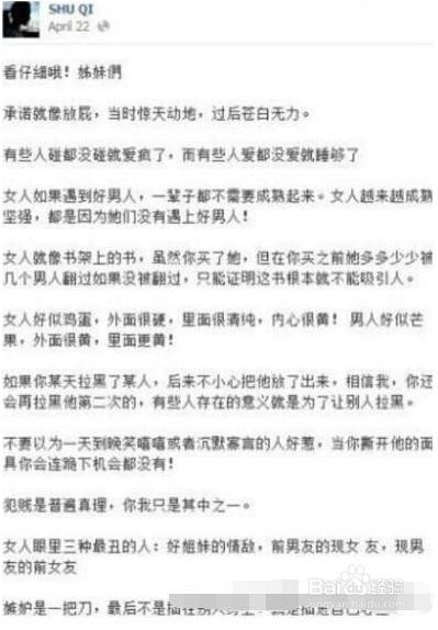 这段文字在可以看出,舒淇的感情似乎遇到了大麻烦,不少人怀疑是不是舒淇与冯德伦遭遇了感情危机。