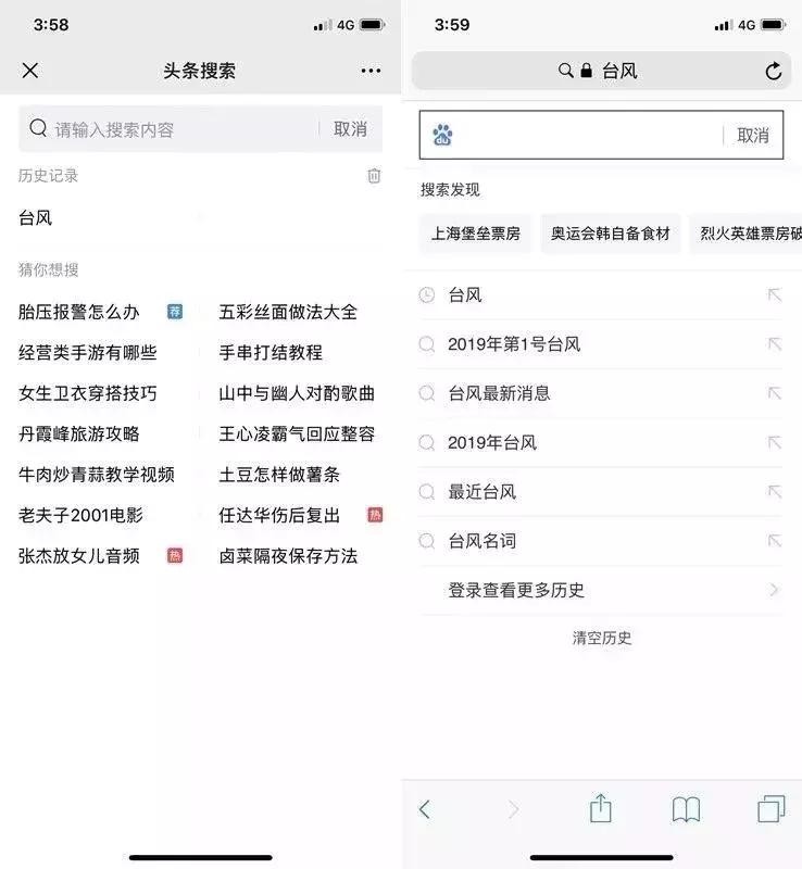 点击搜索框后,头条搜索会出现历史记录和猜你想搜,百度搜索则是搜索发现和历史记录。