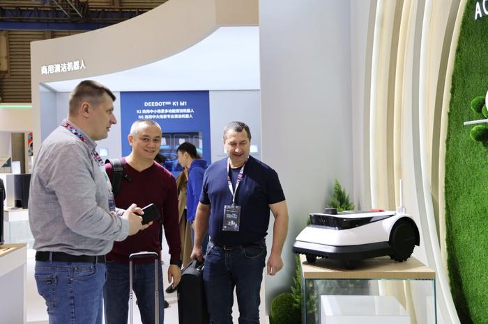 科沃斯 DEEBOT PRO K1 和 M1 一大一小两台机器人配合工作,通过科沃斯首创的 HIVE 系统实现多机协同,大大提高了商用环境清洁效率和服务质量。匹配不同场景的智慧清洁解决方案,科沃斯商用清洁机器人可以满足综合商业体、写字楼、酒店等不同场景的清洁需求,全租赁的商业模式也降低了商用客户的使用成本,在展会现场收获众多用户的关注和咨询。