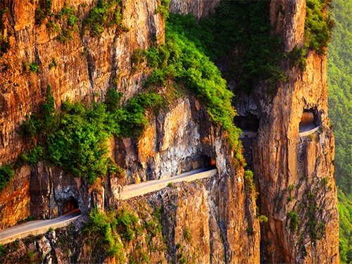 起首看看这个位于绝壁上的村落吧,它便是“郭亮村”,名气异常的大,郭亮村位于河南省新乡市辉县沙窑乡,身处在千仞壁立的山崖上,所处的地势异常的险峻,这里的绝壁峡谷的“挂壁公路”异常的闻名的,这条公路是在1972年的时刻当地村民申明信带领着13位村民用钢锤 、钢钎这样的原始工具历经了5年的时间才修建出来的公路,这条公路高5米、宽4米,全长1300米的。