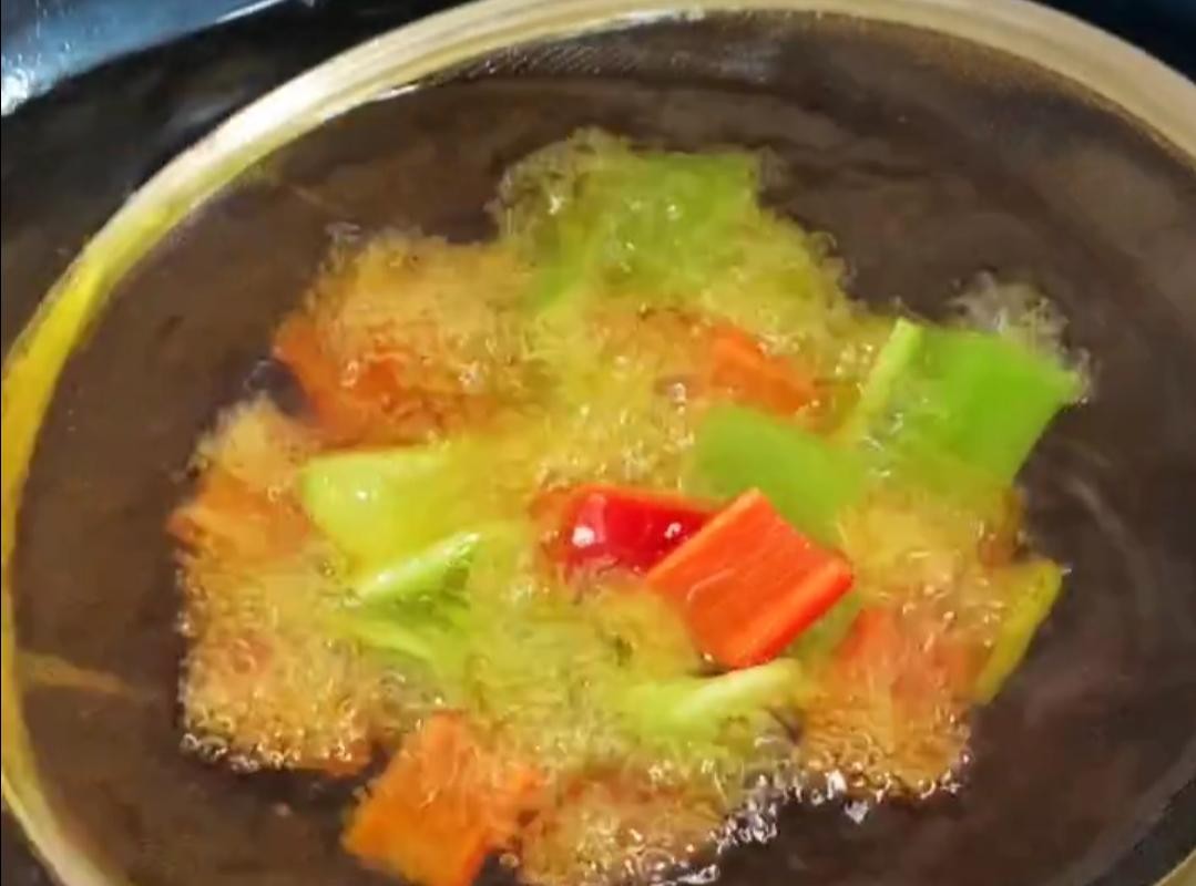 还有尖椒也炸一下捞出备用。