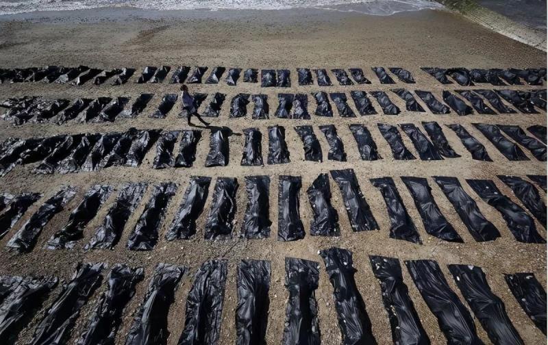 不管在养老院的,还是流落街头的,都被政府抛弃,被收到裹尸袋了,码的整整齐齐。