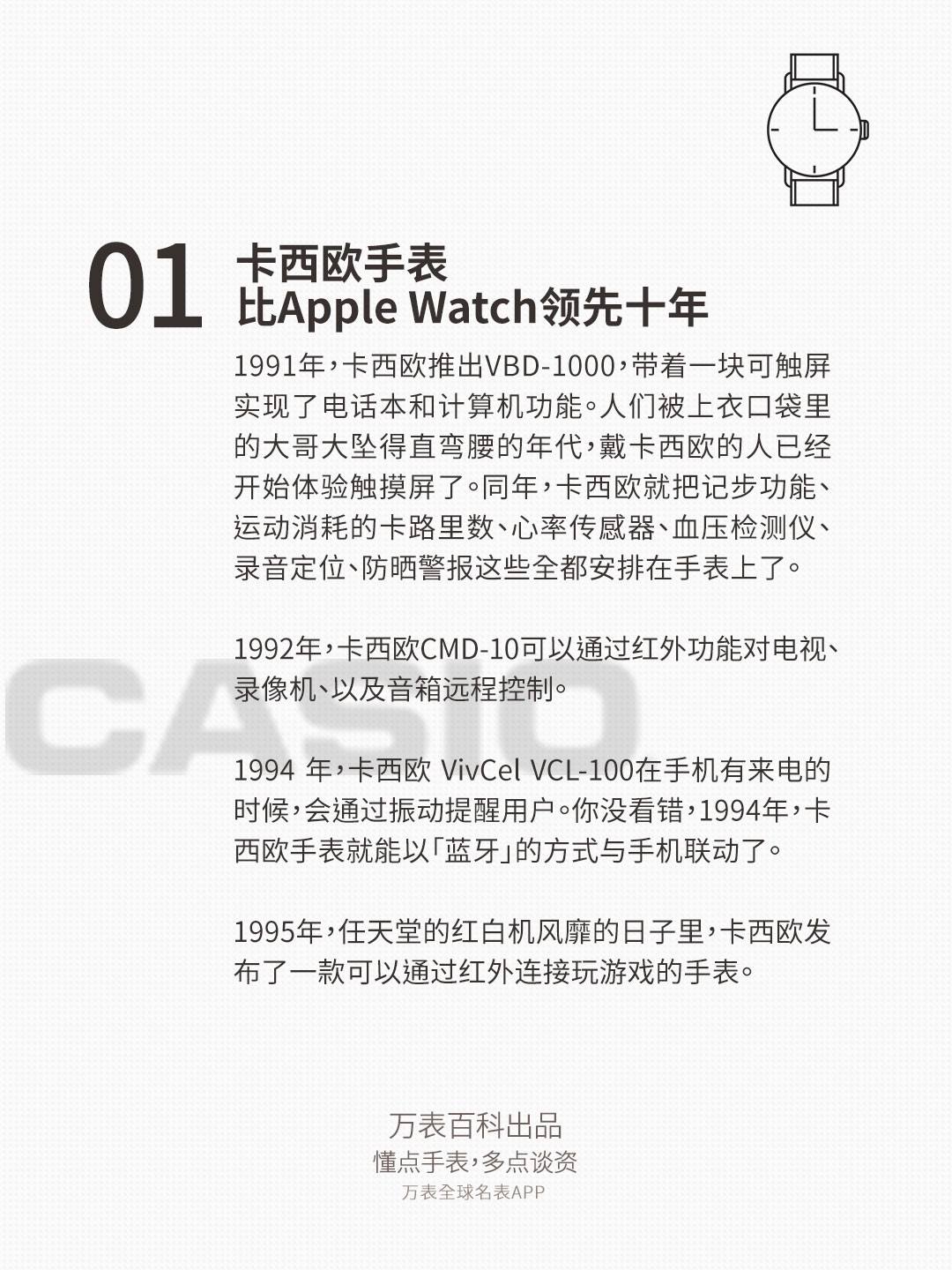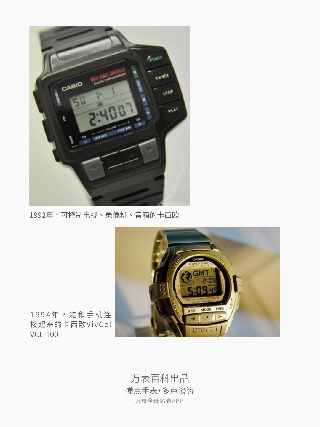 1991年,卡西欧推出VBD-1000,可触屏实现了电话本和计算机功能。人们被上衣口袋里的大哥大坠得直弯腰的年代,戴卡西欧的人已经开始体验触摸屏了。同年,卡西欧就把记步功能、运动消耗的卡路里数、心率传感器、血压检测仪、录音定位、防晒警报这些全都安排在手表上了。