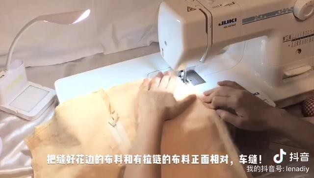 布料裁剪完后,就可以进行缝纫了,缝纫前先将拉链用珠针固定,进行车缝。另一边跟上一步操作一样。拉链缝好后,将布料的边和花边对齐,再进行车缝,我做的是一个正方形的抱枕,所以每个边的长度都是一样的,花边也要重复对四个边进行车缝。
