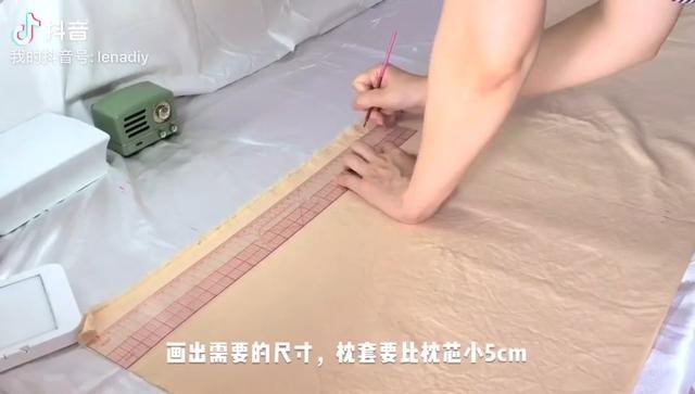 用尺子先画好需要的尺寸,要注意枕套要比枕芯小5CM,同时裁剪的时候记得要流出1CM的缝份。