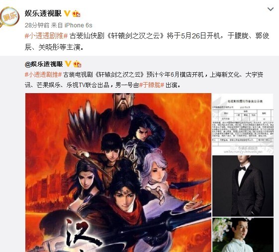 其实最早有消息说电视剧《轩辕剑之汉之云》男主将由杨洋担任本计划时今年2月开机。