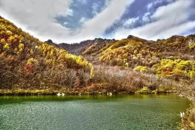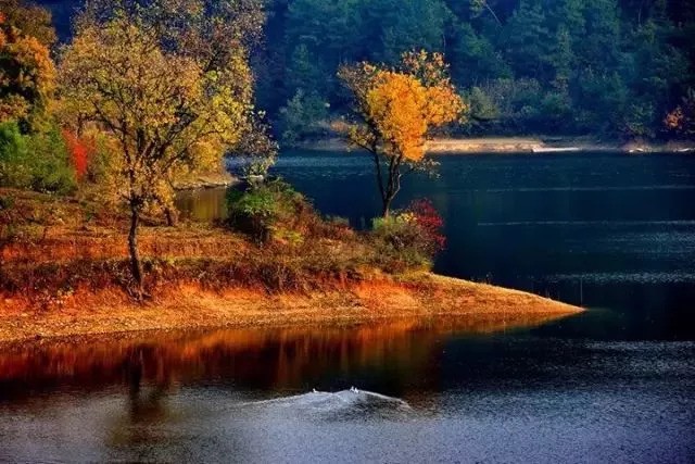这里秋天更是美极一时,山林草木的层林尽染,云霞婀娜多姿洒在天边,蓝天白云又轻轻地躺在了碧水里,大美至此!
