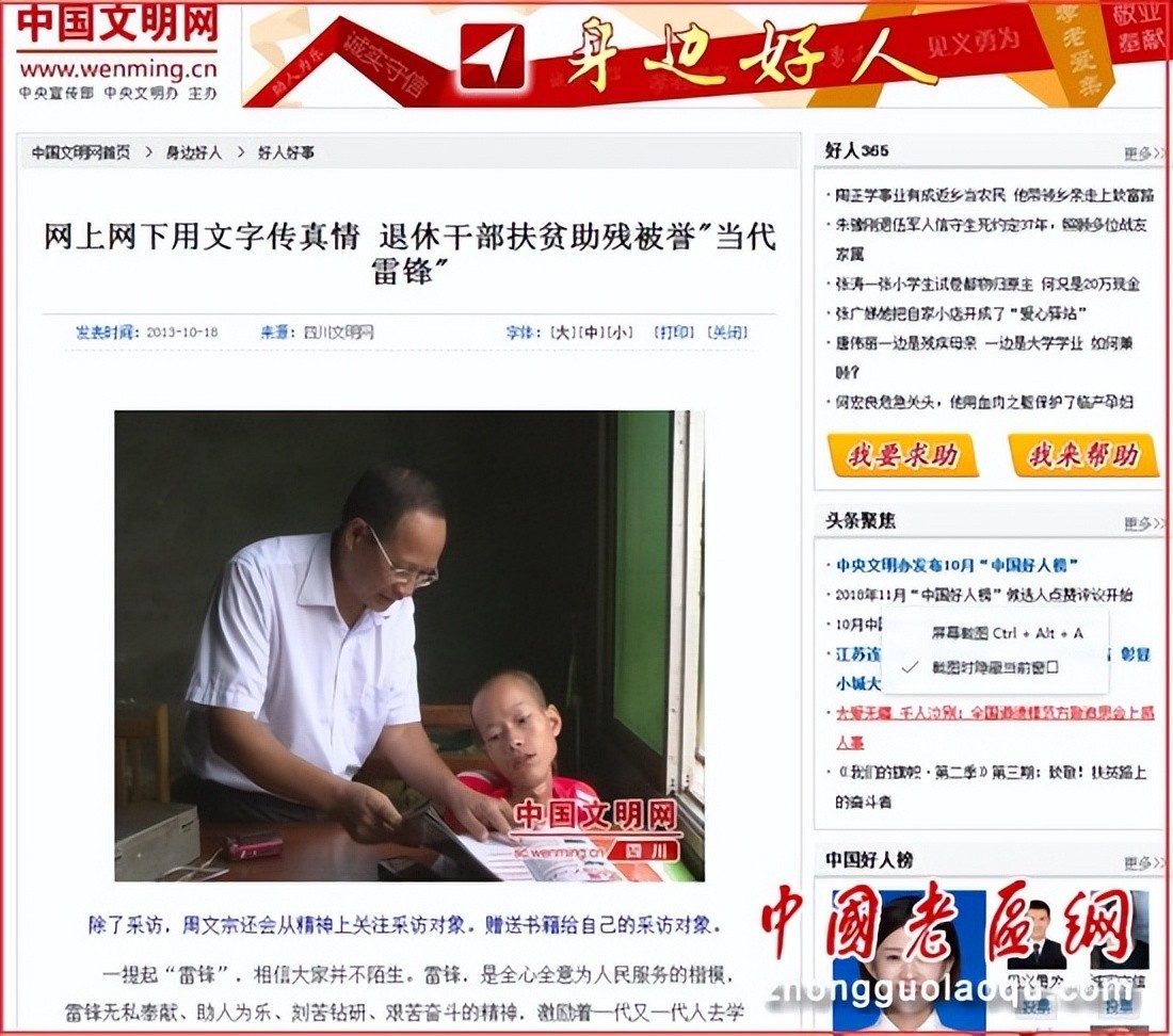 值此“国际志愿者日”来临之际,回顾自己四十多年来坚持弘扬雷锋精神、志愿精神,痴情公益,无私奉献,主动积极为弱势群体创造美好生活做贡献,受到受助群众欢迎和社会各界好评。2013年10月18日,中国文明网首页要闻栏目以《网上网下用文字传真情 退休干部扶贫助残被誉“当代雷锋”》介绍我学雷锋的故事。今年初,我被评为“四川省优秀老干部志愿者”,感到十分欣慰,激励自己生命不息,志愿服务不止。