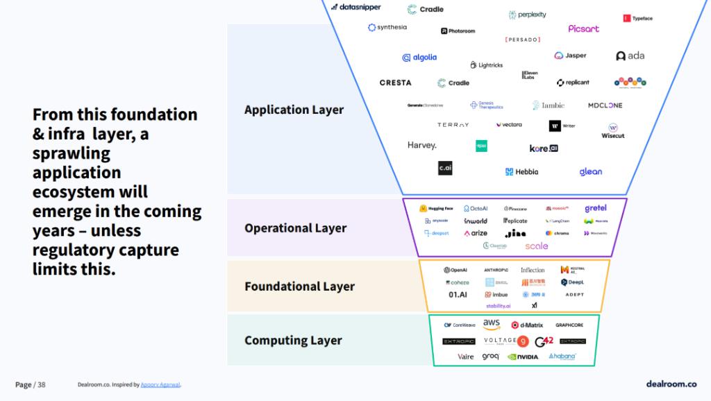 云基础设施层 ( cloud infra layer ) 约占 AI 总投资的 42%,谷歌云、亚马逊云服务 AWS 和微软 Azure 是主要玩家。