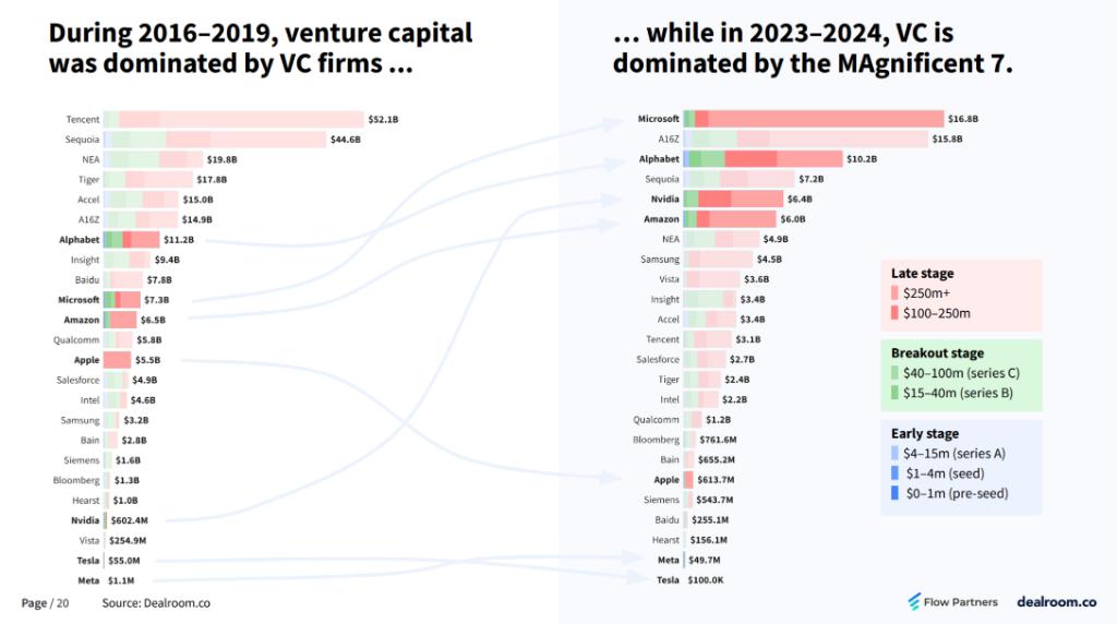 " 七姐妹 " 在风险投资领域的活动显著增加,尤其是那些已经有一定规模和业绩但尚未上市的公司,到 2025-2024 年,它们已成为最大的科技 VC。
