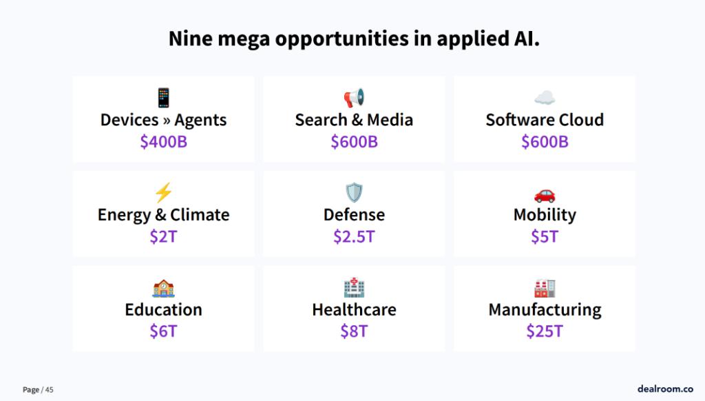 AI 应用存在大量机遇,报告指出,医疗保健、设备、媒体、软件云、气候、教育、国防、移动和制造业,AI 的经济潜力达 50 万亿美元。