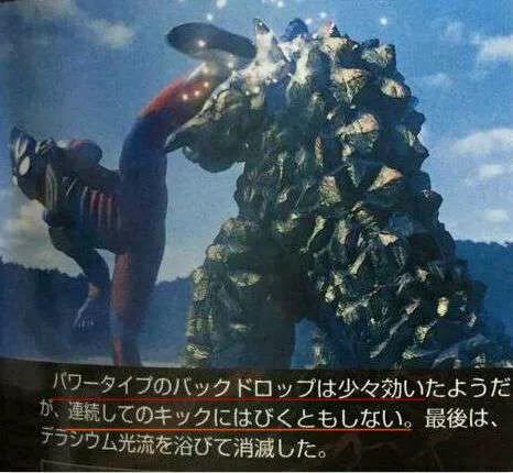 迪迦用强力型飞踢踢向对方,结果被弹飞。