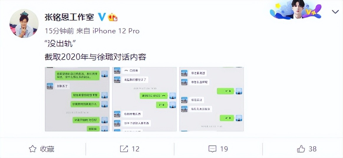 此前,8月26日,张铭恩工作室在公共平台上连发数条博文,曝光了张铭恩与胡冰卿、徐璐的聊天记录,时隔两年否认出轨劈腿等谣言,并声称其所发布的相关内容属实,愿意承担一切法律责任”。