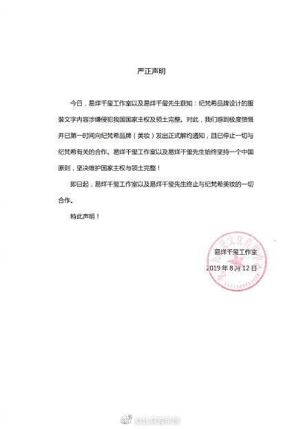易烊千玺与纪梵希解约 【纪梵希道歉:坚决拥护一个中国原则】因纪梵希T恤将香港与台湾单独列为国家,12日中午,@易烊千玺JacksonYee工作室 发声明称:“易烊千玺工作室以及易烊千玺先生始终坚持一个中国原则,坚决维护国家主权与领土完整! ”@TFBOYS-易烊千玺 工作室表示,“已第一时间向纪梵希(美妆)品牌发出正式解约通知,且已停止一切与纪梵希有关的合作”。12日,@GIVENCHY纪梵希 发表致歉声明称,关于今日引起部分网友讨论的海外市场纪梵希印花T恤中的错误而引发大家的关注,对此深表歉意。“对于任何的人为疏忽与错误,我们一定立即纠正并引以为戒。”并表示纪梵希品牌一贯尊重中国主权,坚决拥护一个中国原则,坚定不移。 (北青报记者 张蕊)