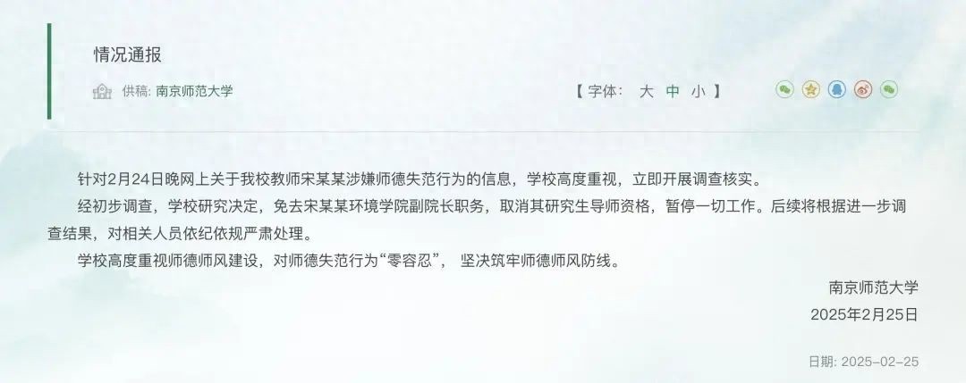 经初步调查,学校研究决定,免去宋某某环境学院副院长职务,取消其研究生导师资格,暂停一切工作。后续将根据进一步调查结果,对相关人员依纪依规严肃处理。