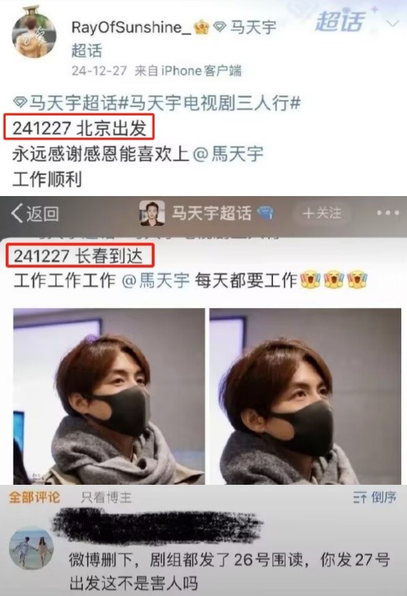 或许有人会说,IP地址不准,或者他的微博是工作人员帮忙发的。但这个说法根本站不住脚,因为马天宇的粉丝在27号当天分享了他从北京出发、长春到达的行程。