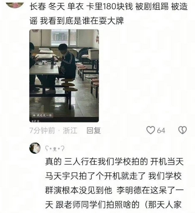 再加上,有网友爆料称马天宇开机当天很快就走了,李明德在拍摄的学校呆了一天,更加让马天宇及其工作室自称他敬业的说法显得不那么理直气壮。